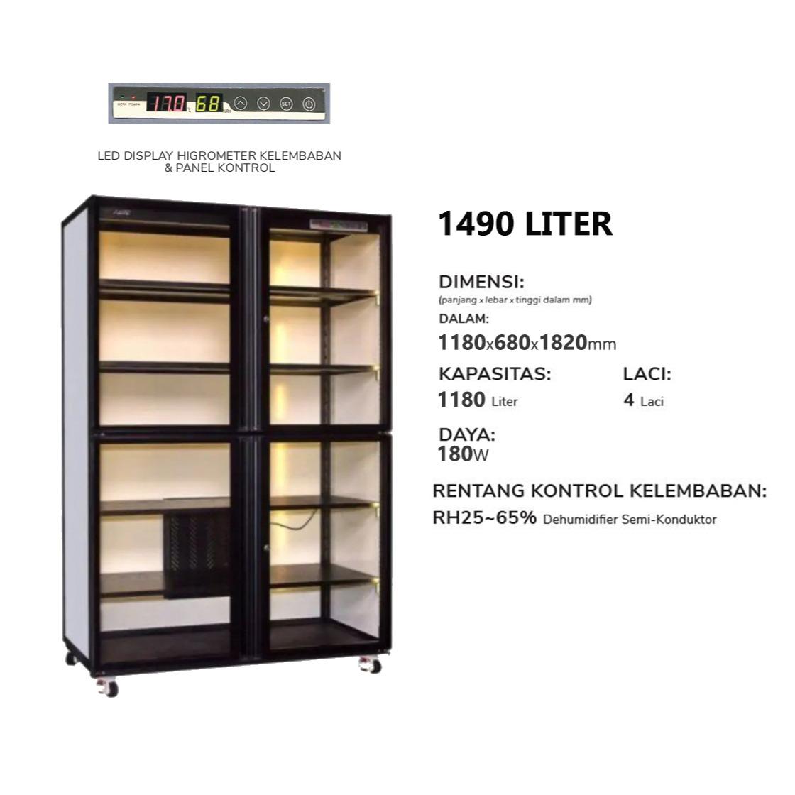 Ailite Digital Dry Cabinet GP-1490L merupakan dry cabinet berukuran sangat besar yang terbuat dari bahan metal pada seluruh bagiannya dengan 4 buah pintu terbuat dari bahan kaca tempered yang sangat kuat dan aman.