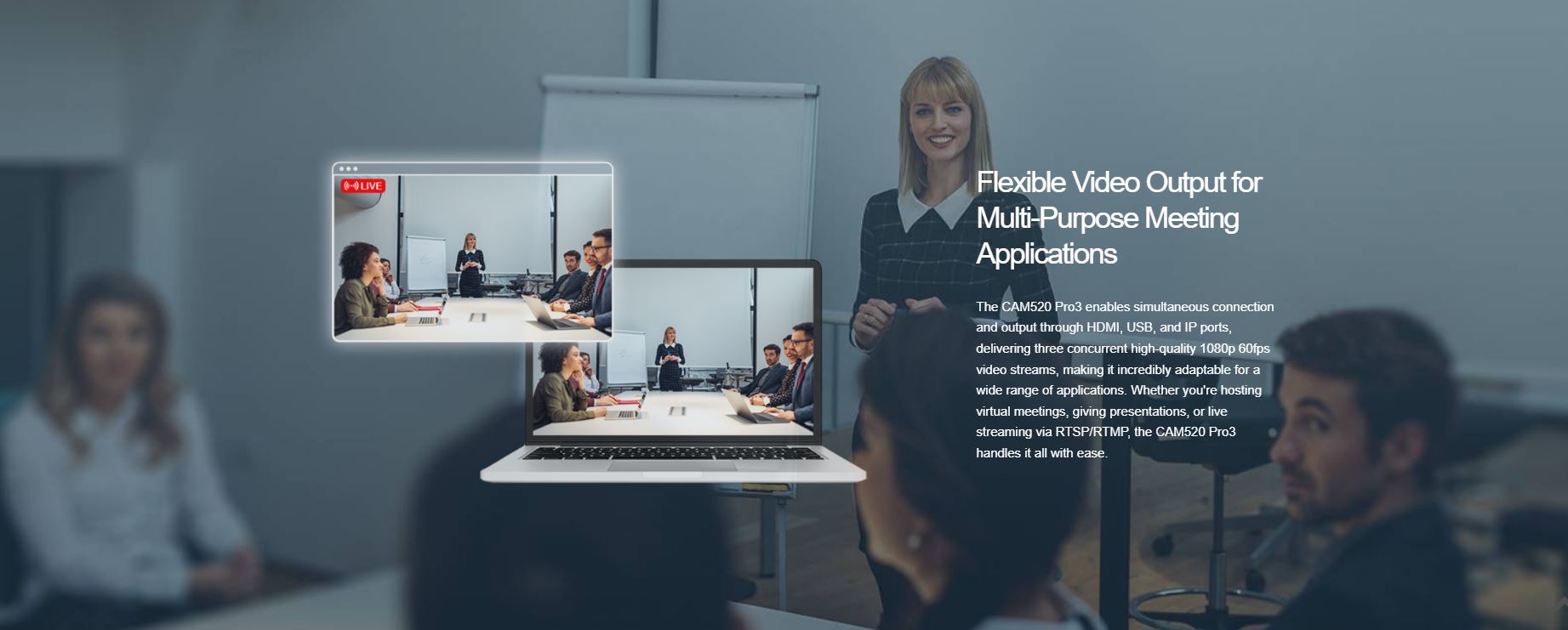 The AVer CAM520 Pro3 is extremely versatile, offering users a 36X total zoom PTZ camera, upgraded AVer SmartFrame, Preset Framing, and a Sony WDR Sensor. In addition, 3-way outputs — including an HDMI connection — deliver more streaming options. But what makes the CAM520 Pro3 truly special is Smart Composition, an embedded AI function that quickly captures meeting participants’ images to facilitate productive video conferences in mid-to-large meeting rooms.
