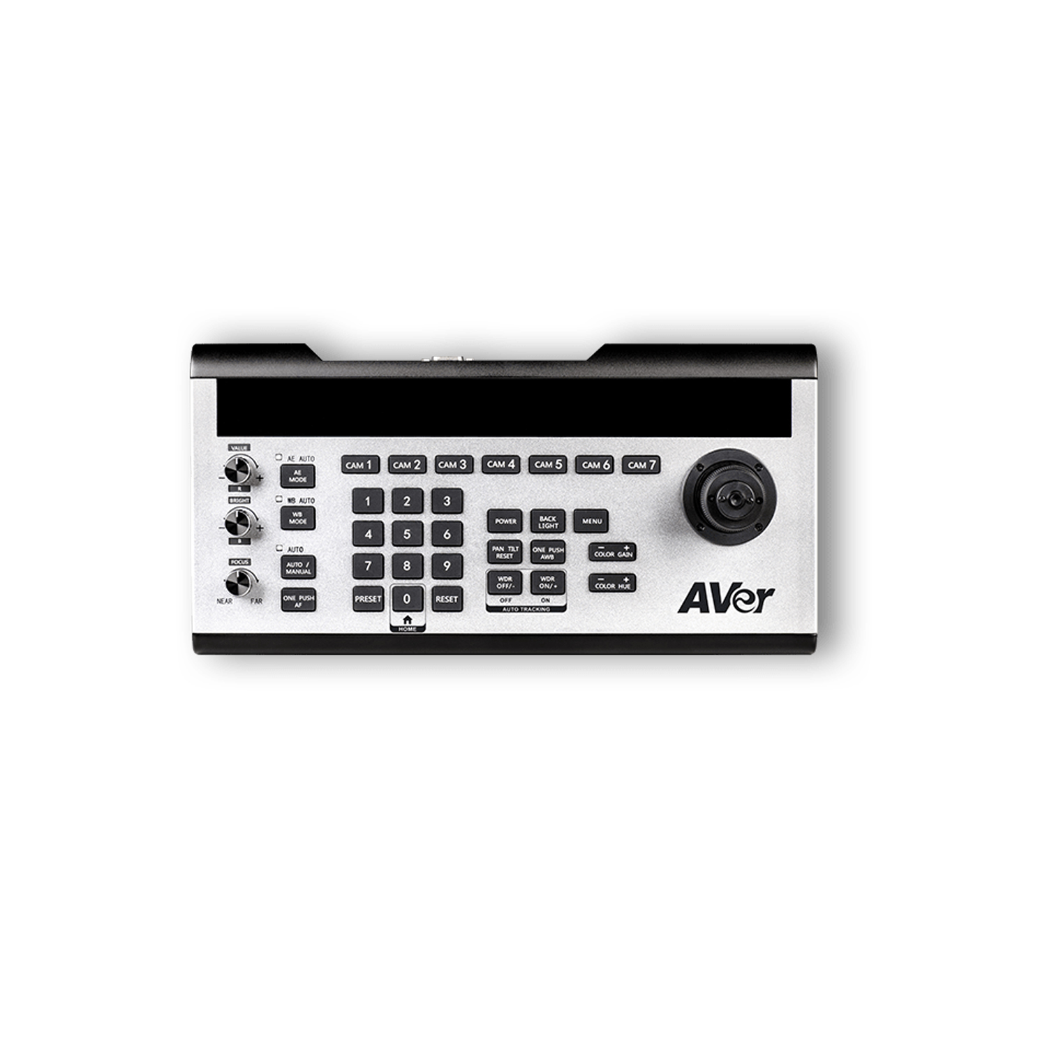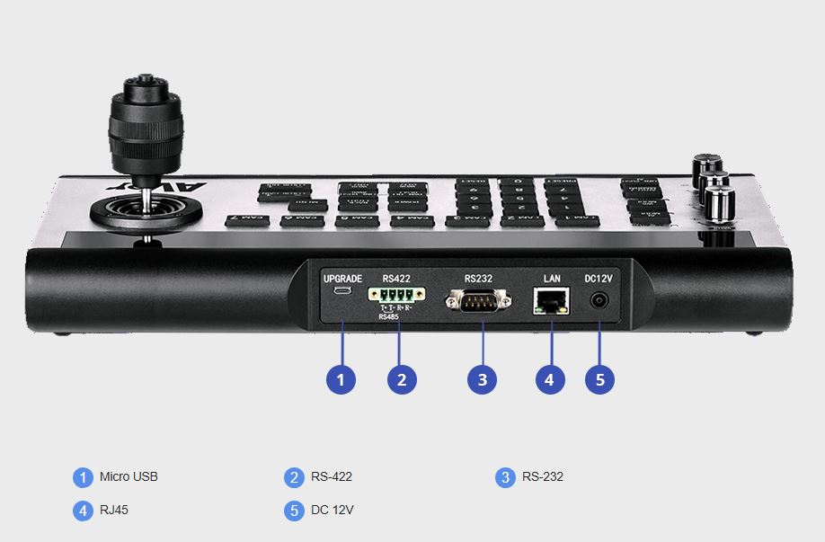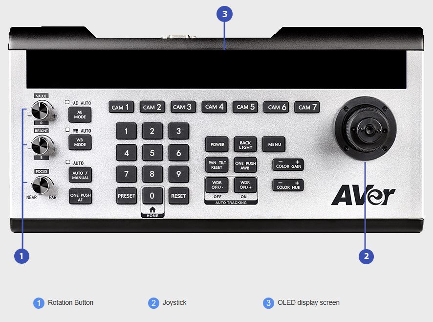 The AVer CL01 is a professional PTZ camera controller with a robust communication interface, built-in VISCA and Pelco-D/P protocols. It supports RS-422 / RS-485 / RS-232 / IP control for compatibility with most PTZ cameras. Simple configuration makes it easy to operate the 7 camera shortcut channels, 3 infinite rotation knobs, and more.
