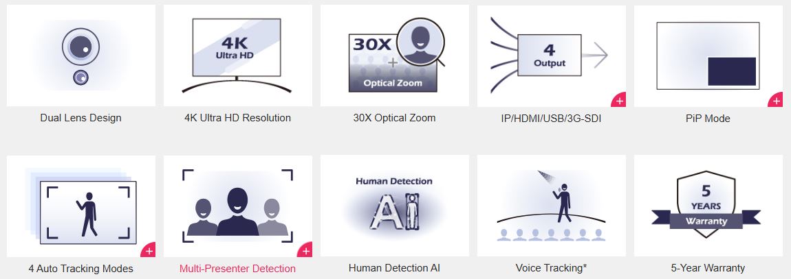 - 4K Ultra HD - 30X Optical Zoom - IP / HDMI / USB / 3G-SDI - Intuitive Web UI - Human Detection AI - Presenter Mode - Zone Mode...