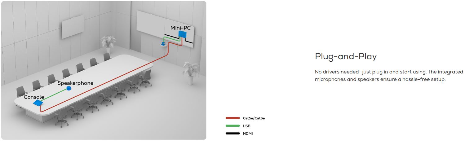 AI algorithms remove background noises like keyboard clicks and air conditioning, focusing solely on human voices. Combined with AI noise cancellation and AEC, it enhances focus and collaboration.