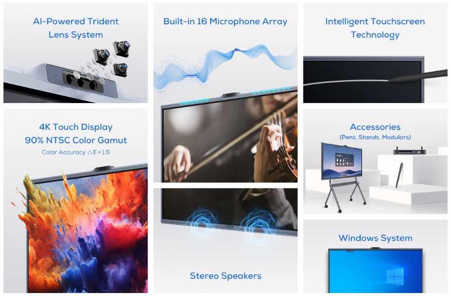 - 86" DLED - 48MP + 8MP dual-camera - 3X optical zoom - Auto-Framing, Automatic gain control - 8-array microphone - Speaker 2*10W + 20W - 90% NTSC color gamut...