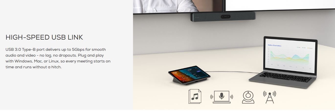 - 4K resolution - 5x digital zoom - 120° Field of view - Wireless screen-sharing to 4 screens - Plug-and-play PoE BYOD videobar - 6 microphones array - 8m voice...