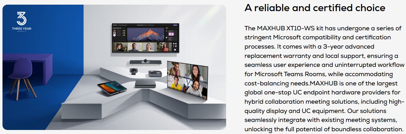 Expanding on the foundation of the XCore Kit, the MAXHUB XT10-WS Kit incorporates a high-quality UC BM35 Speakerphone and UC W31 USB Camera. Catering to participants’ dynamic audio and video needs, this bundle provides a flexible and seamless collaboration experience for any focus room or small space. The Kit also helps to facilitate the switch to Microsoft Teams Rooms Smart Spaces for BYOD scenarios, enhancing Teams-native audio and video experiences while accommodating cost-balancing needs. The MAXHUB XT10-WS Kit comes with an industry leading 3-year advanced replacement warranty and local support.