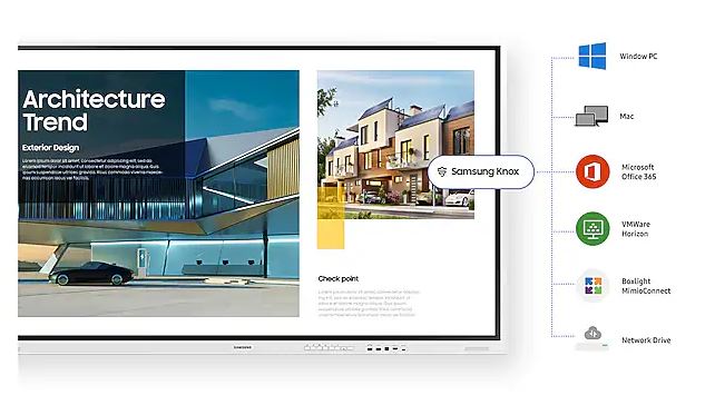 Samsung Interactive Pro delivers a realistic, smooth writing and drawing experience. Touch technology with 26ms latency and 2,048 points of pressure is built directly into the display to unlock creativity. Plus, Interactive Pro enables up to 20 simultaneous touch points for enhanced collaboration.