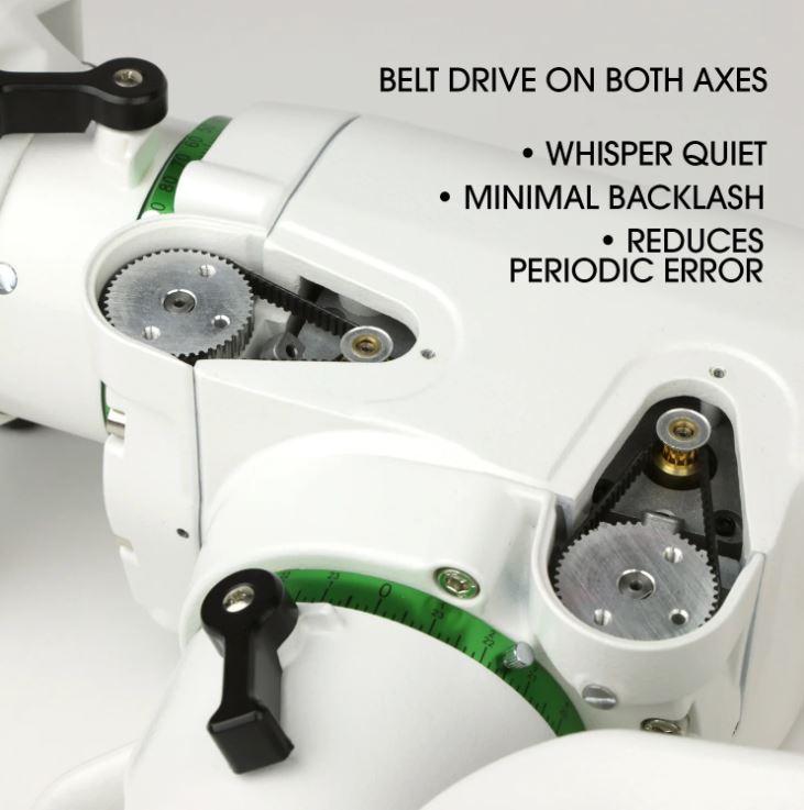 The EQ6-R Pro uses Stepper motors with a 1.8° step angle and 64 micro steps driven. Stepper motors are quieter than servo motors, providing accuracy up to 1 arc minute without waking your neighbors from buzzing motors.